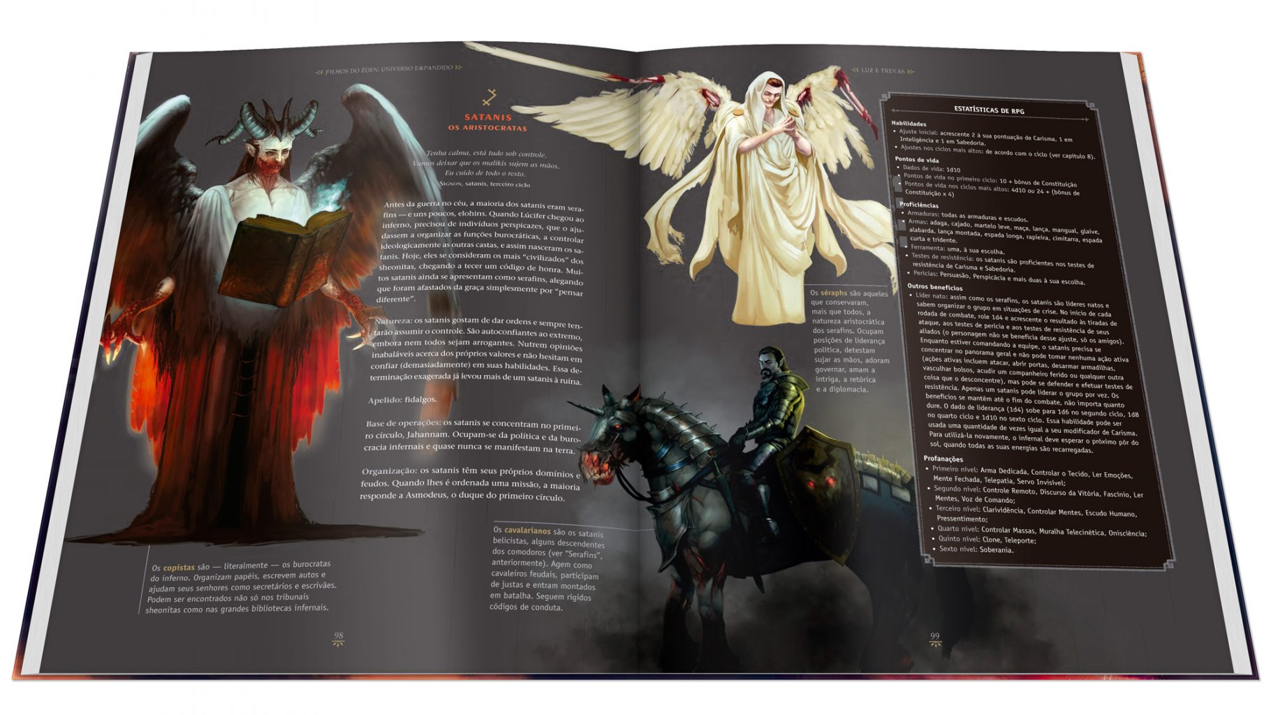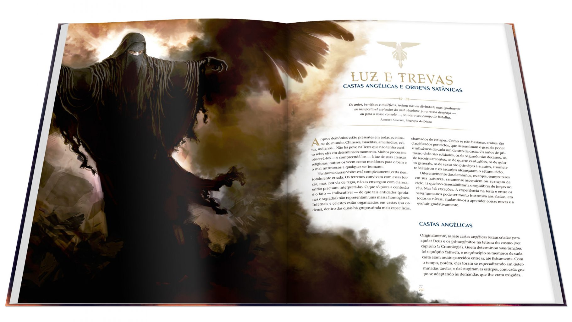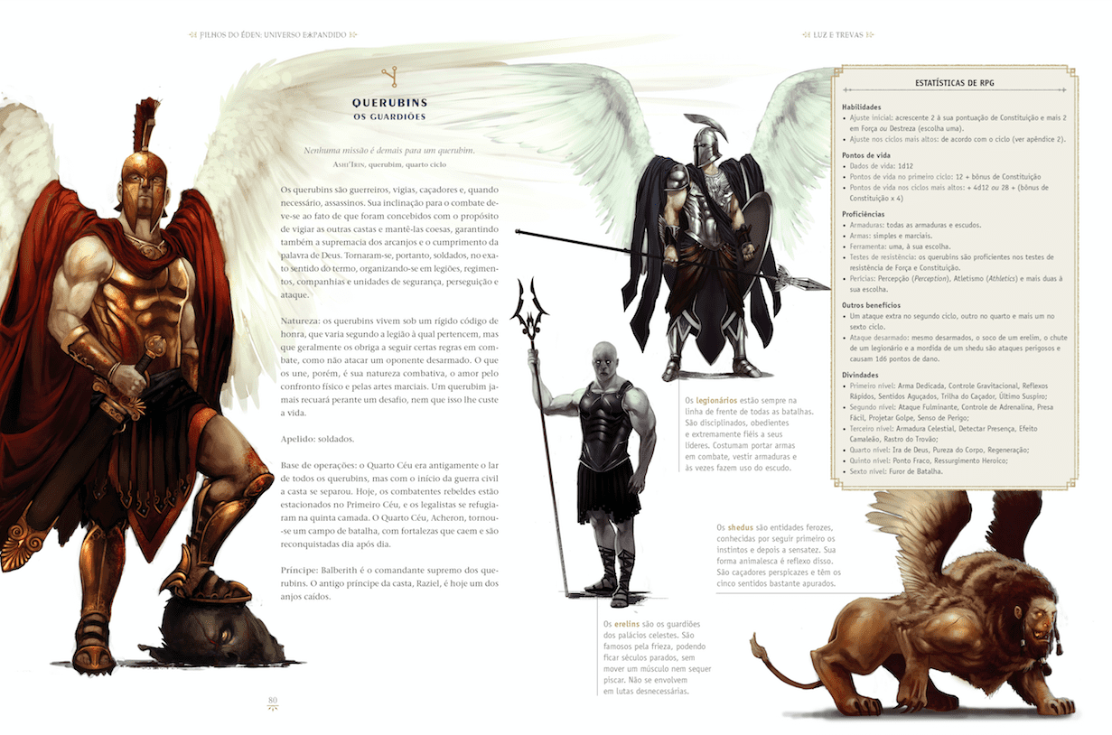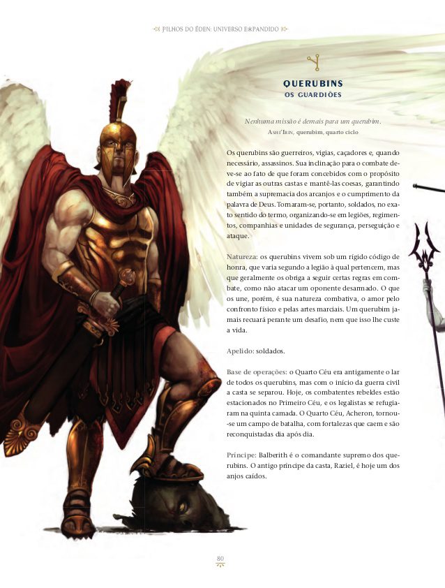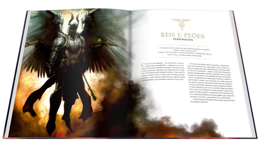Tudo sobre os cenários, castas de anjos, heróis e vilões, bestiário completo, um conjunto de diretrizes para criação de fanfics, além de um manual completo para jogadores e mestres de RPG para ambientar os jogos em meio de anjos, demônios e deuses.